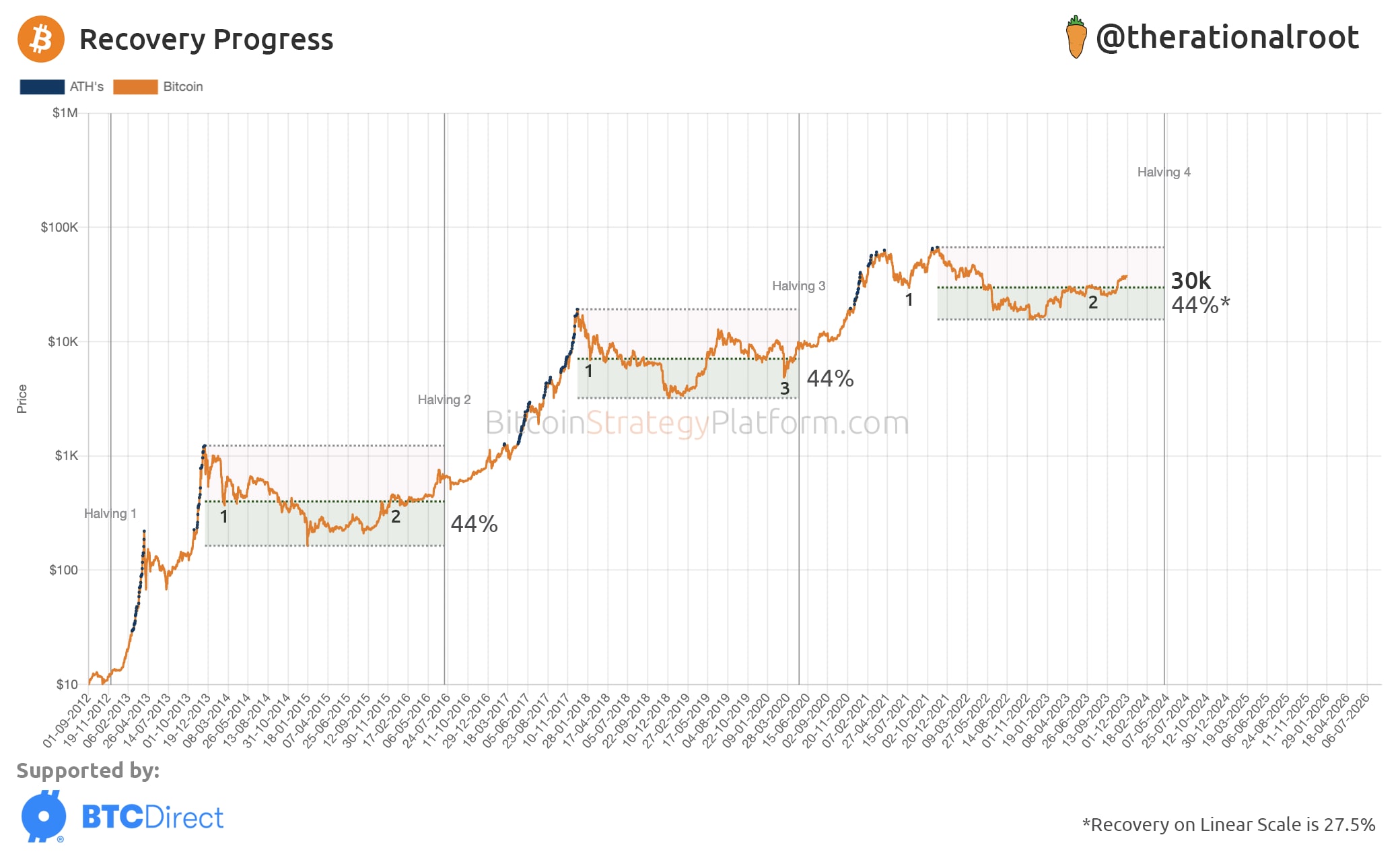 With Bitcoin breaking through the $38,000 level and with a 60% recovery already in play, a figure typically seen near Halving events, one might question if we’re currently overvalued. To address this, let’s discuss the downside risks. For this we compare the $30,000 level to prior cycles, aligning the recovery (green areas) to 44% - resulting precisely in the current cycle’s $30,000 mark.