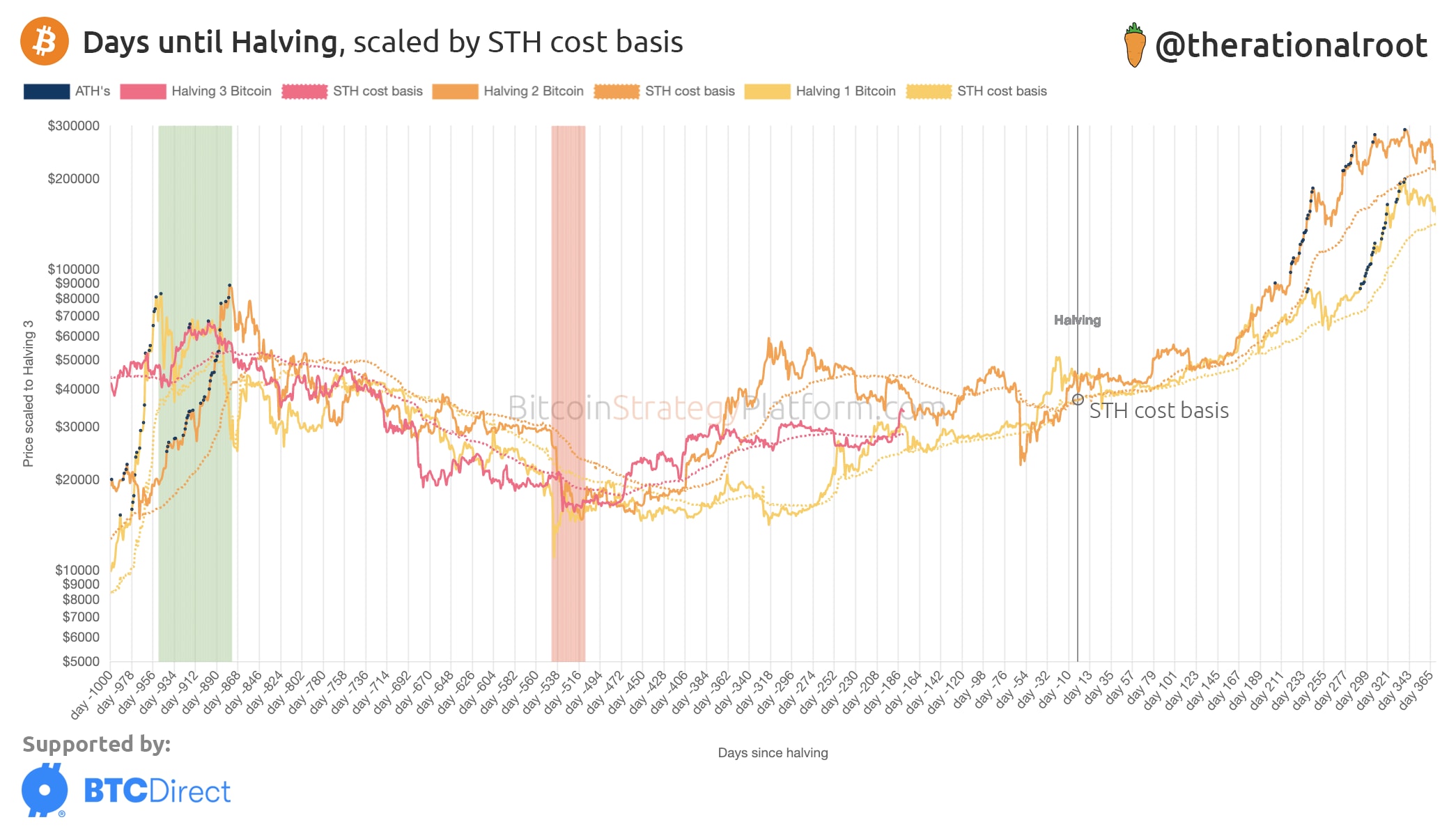 With the halving event 87.5% complete, the most accurate perspective on Bitcoin's cycles is the alignment of days remaining until the halving. This assessment is further enriched by integrating the STH cost basis into the chart.