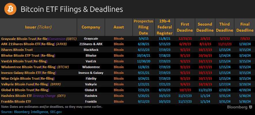 With the false alarm behind us, let's shift our focus to the real deal—Bitcoin spot ETF filings and their deadlines. As we analyze the data, we can see that the second deadline for most filings has already passed. The next significant milestone is on January 15, 2024, with the final deadline set for March 15, 2024. There's a high likelihood of an ETF approval in the first quarter of 2024, closely followed by the highly anticipated Bitcoin Halving in April 2024. This double power play forms the ideal combination to ignite a 2024 bull market.