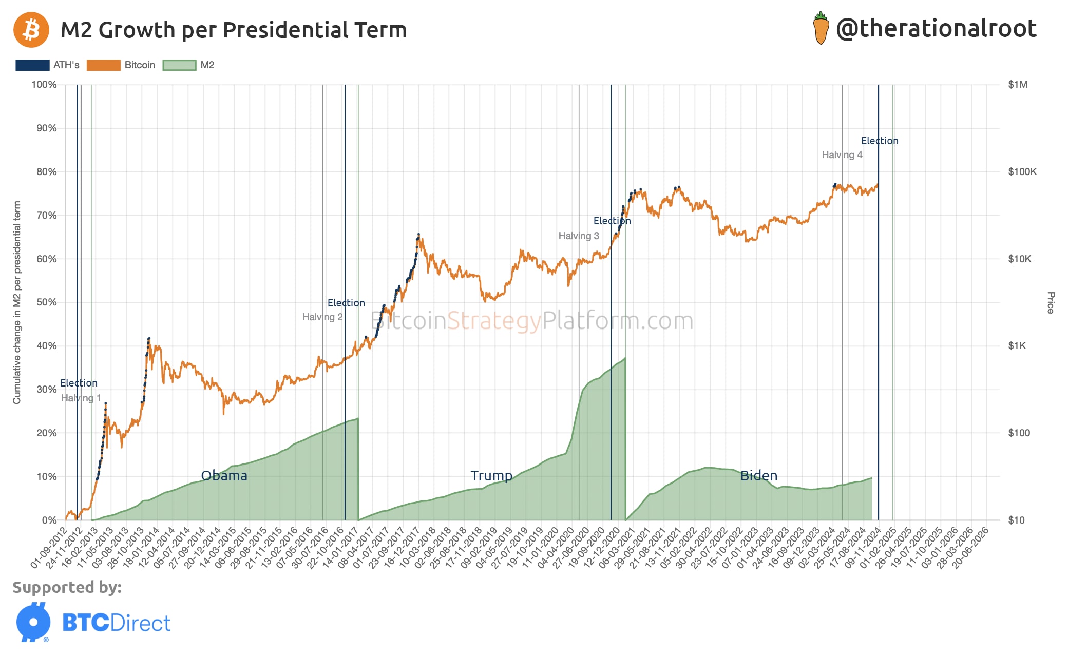 In the chart above, we observe the cumulative change in the U.S. Dollar Money Supply (M2) across presidential terms. The blue vertical line marks Election Day, followed by the green vertical line marking the start of each presidential term (4-year period).