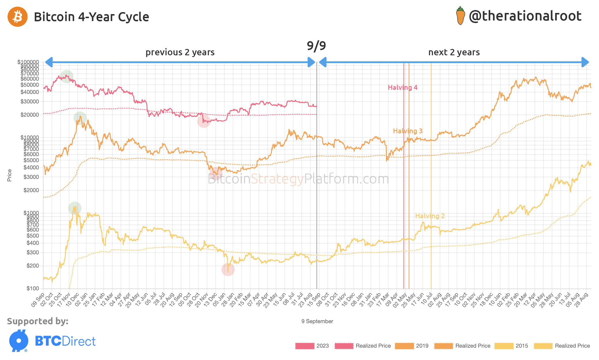 We've charted the 4-year cycle, using today's date as a reference and comparing it with the same day in previous cycles. The vertical gray line represents today, with two years visualized on either side.