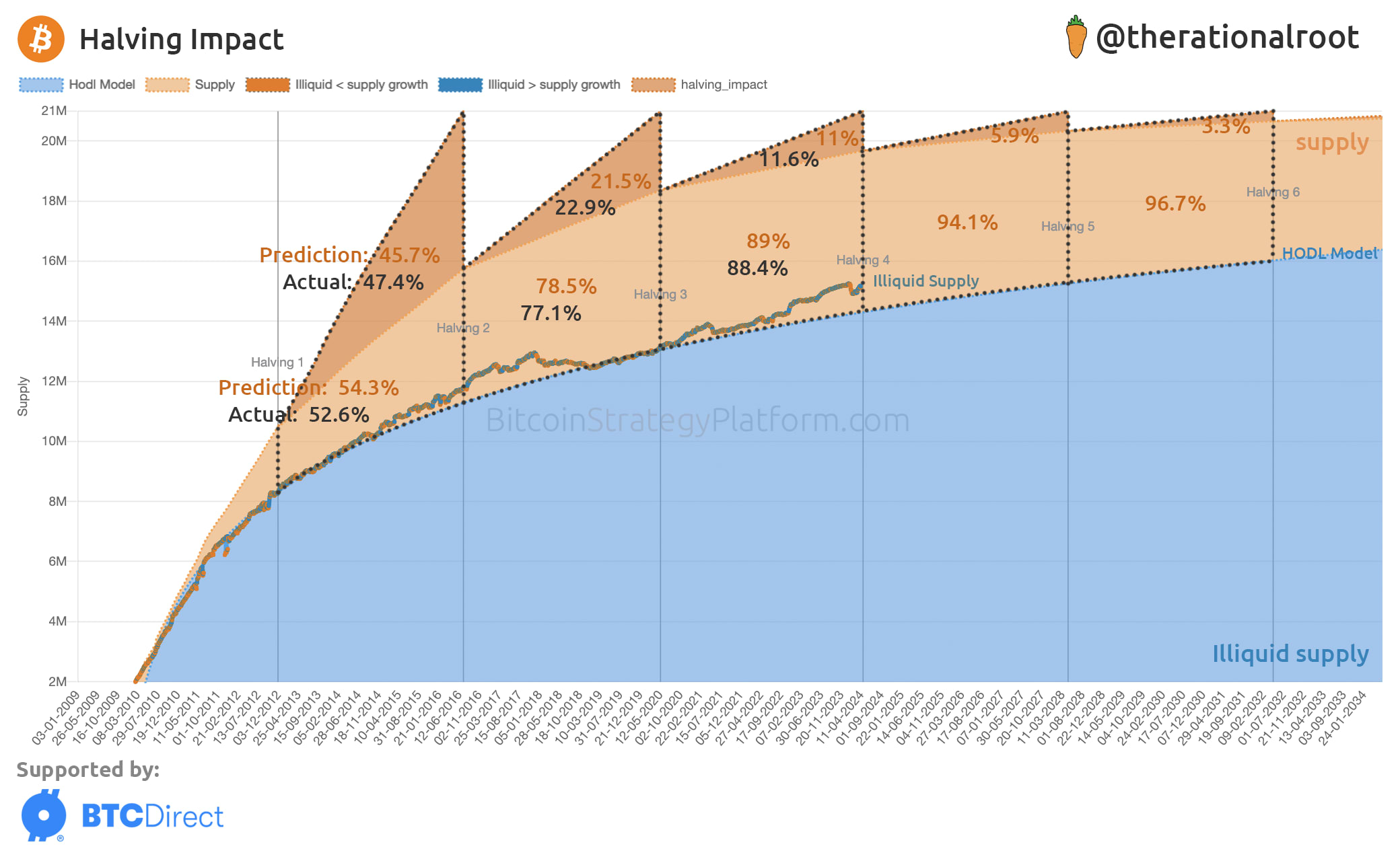In the above chart, we plot the circulating supply of bitcoin and the trajectory of supply issuance if we did NOT have a Halving (dark orange triangles). We also show illiquid supply based on the HODL model (in blue), which allows us to project the actual illiquid supply (also shown in the chart) into the future. The Illiquid supply is mostly in the hands of Hodlers, who primarily use Bitcoin as a Store Of Value. The remaining supply (in light orange) represents the available supply for trade. These are estimates, and while some Hodlers take profit, as seen in a different time-based variant that is LTH supply, this offers a reasonable representation overall.