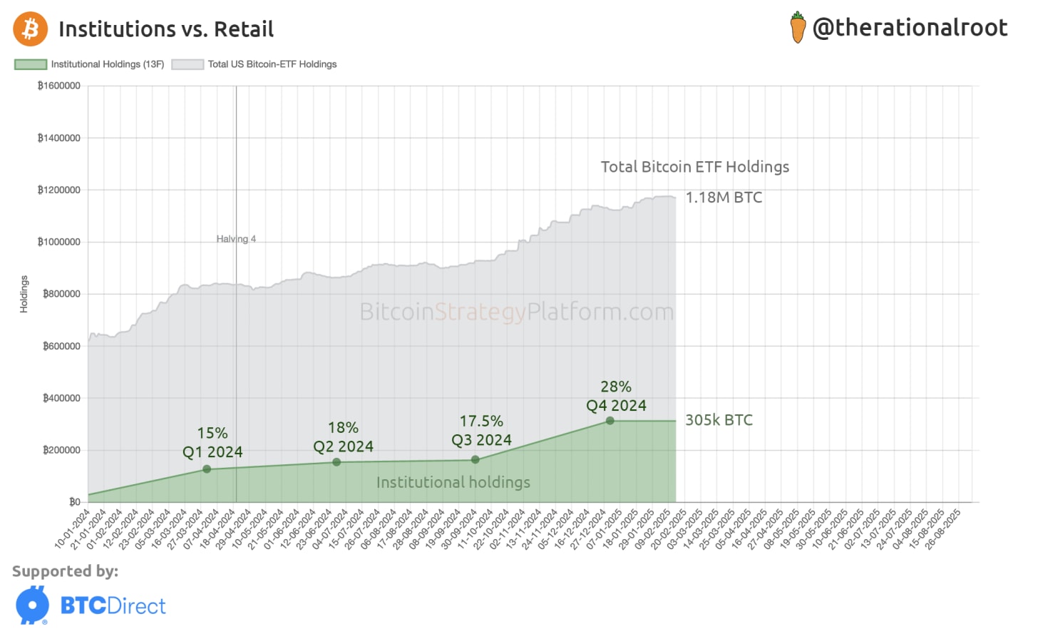 The chart above shows institutional Bitcoin holdings since the ETF approval. Institutions now hold over 300,000 BTC, nearly double their holdings from Q3 2024!