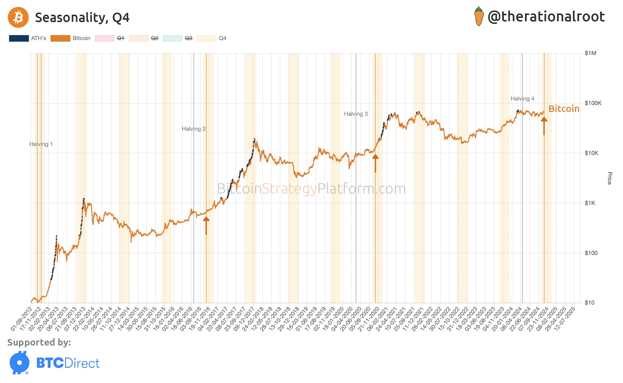 While the ‘Uptober’ meme circulates on social media, Bitcoin’s performance should really be viewed through the lens of the 4-year cycle rather than a year-to-year comparison. Monthly performance can vary greatly depending on the stage of the cycle. Instead of using every year’s data, which would result in 12 datapoints, we focus on the cyclical pattern, which unfortunately provides only three datapoints. In the chart above, seasonality is highlighted, showing Q4 performance across the different years. The orange arrows represent the ‘current’ stage in the 4-year cycle from 4, 8, and 12 years ago, respectively.