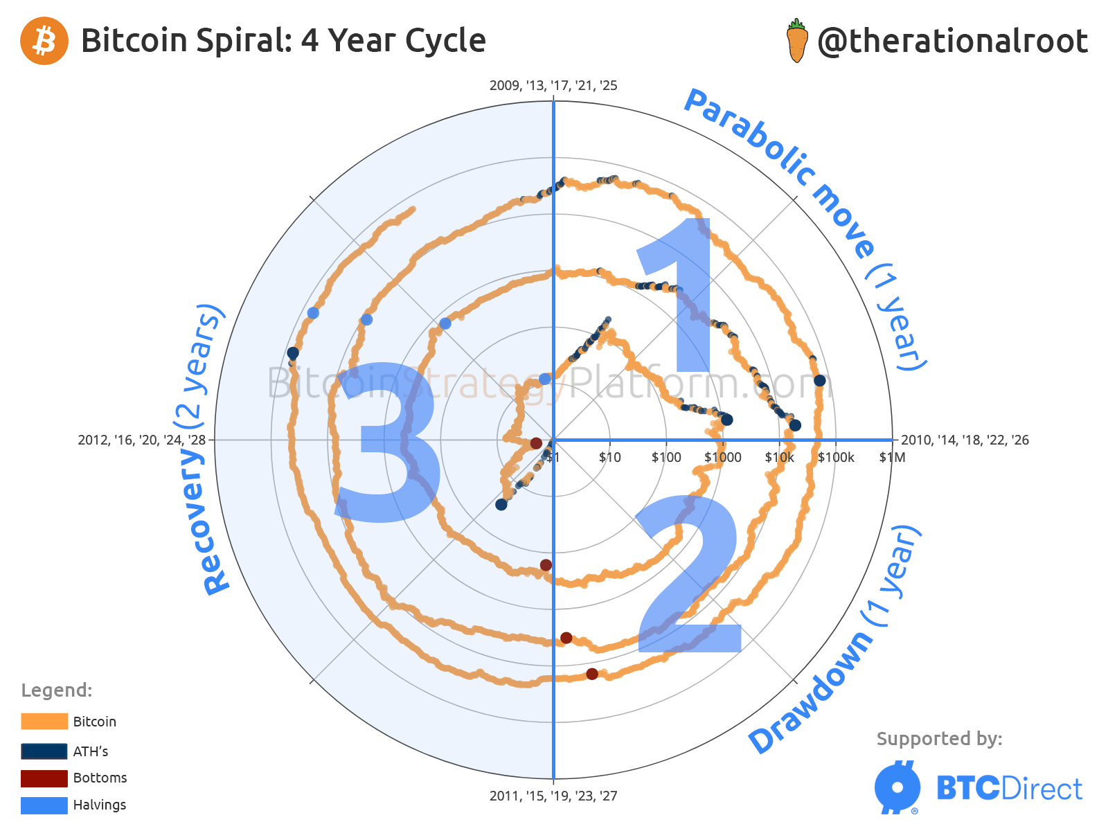 The Bitcoin 4-year cycle can be subdivided into 3 stages: the parabolic move, the drawdown, and the recovery stage.