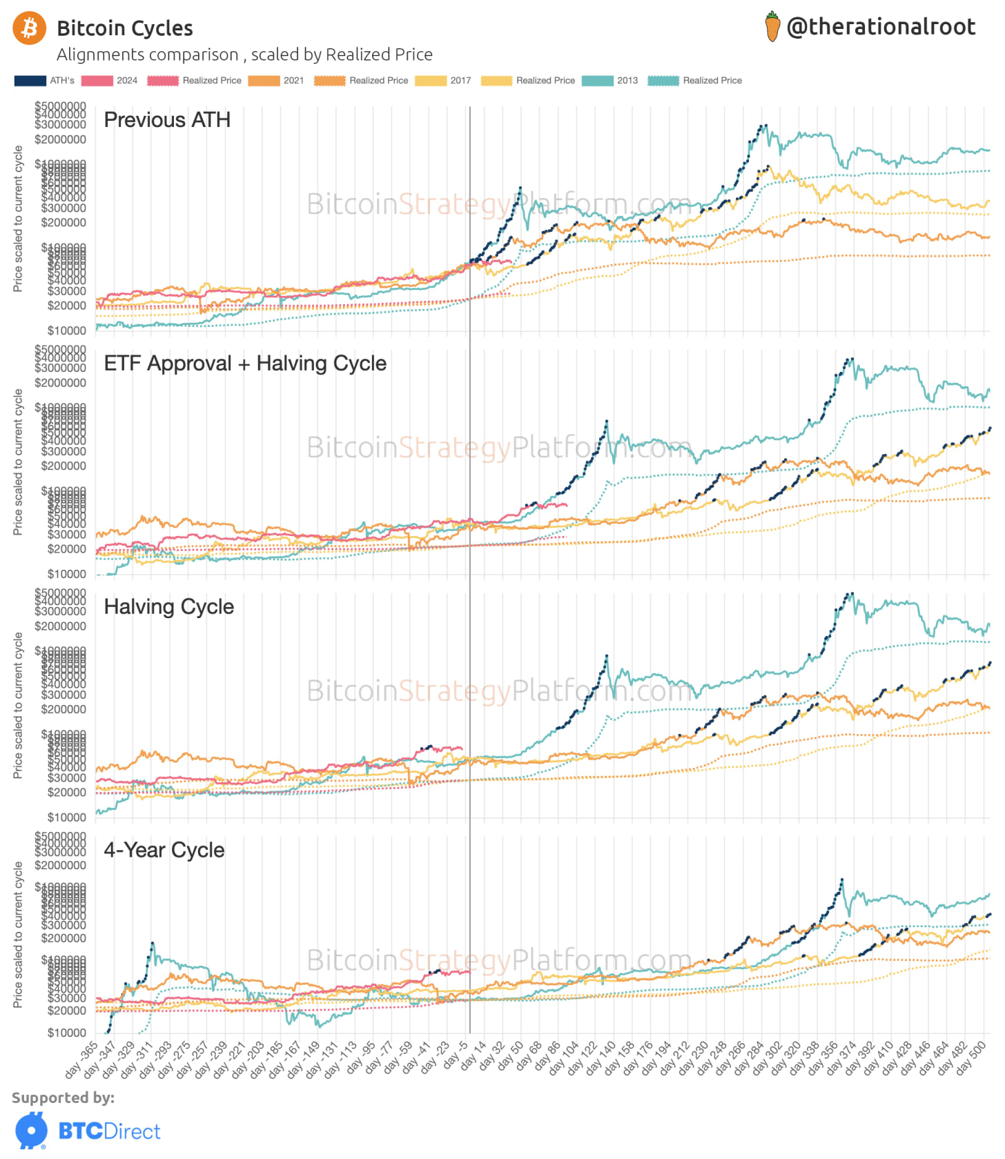 This week, I have the ultimate cycle comparison for you! At Bitcoin Strategy, we believe that along with on-chain analysis, it's crucial to focus on cycles. Human psychology, driven by fear and greed, leads to cyclical behavior in all markets. Catalysts, like the ETFs and the Halving, influence these fear and greed levels. We’re at an unprecedented moment in Bitcoin’s history, reaching an ATH before the Halving. In this edition, we've aligned the Bitcoin cycles in the best possible ways to give you a complete picture, considering these unique circumstances